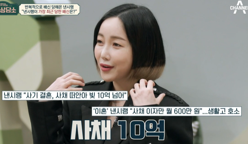 낸시랭 : 결혼을 전제로 2년간 사귀었던 남자친구가 있었는데, 알고 봤더니 유부남에 딸이 있었던 거였어요. 너무 큰 충격을 받았어요. 말문이 막혔죠.